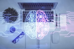 Multi exposure of brain sketch hologram over topview work table background with computer. Concept of big data.